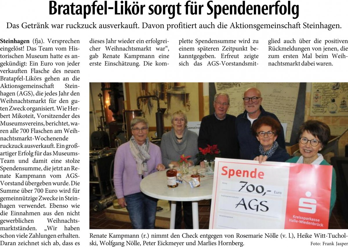Am 30. Juni 1993 unterzeichneten die Gründereltern den Vertrag zum eingetragenen Verein „Historisches Museum Steinhagen e. V.“. Seitdem ist viel passiert: Das Museum selbst wurde aufgebaut und zu einem Anker- und Treffpunkt für das Leben im Ortskern von Steinhagen entwickelt. Der Verein hat ein sehr vitales Innenleben, was sich zum einen im Sammeln, Sortieren und Präsentieren von Gegenständen, Dokumenten und Geschichten aus mittlerweile 765 Jahren Steinhagen niederschlägt. Zum anderen wird vom Verein auch am Steinhagen-Flair gearbeitet, sprich: ehrenamtlich werden Top-Erzeugnisse des Steinhagen Brennereiwesens gebrannt und maszeriert. Bei Besuchern und bei Führungen im Museum kommen sie super an und werden auch gern als Botschaften Steinhagener Lebensqualität verschenkt.